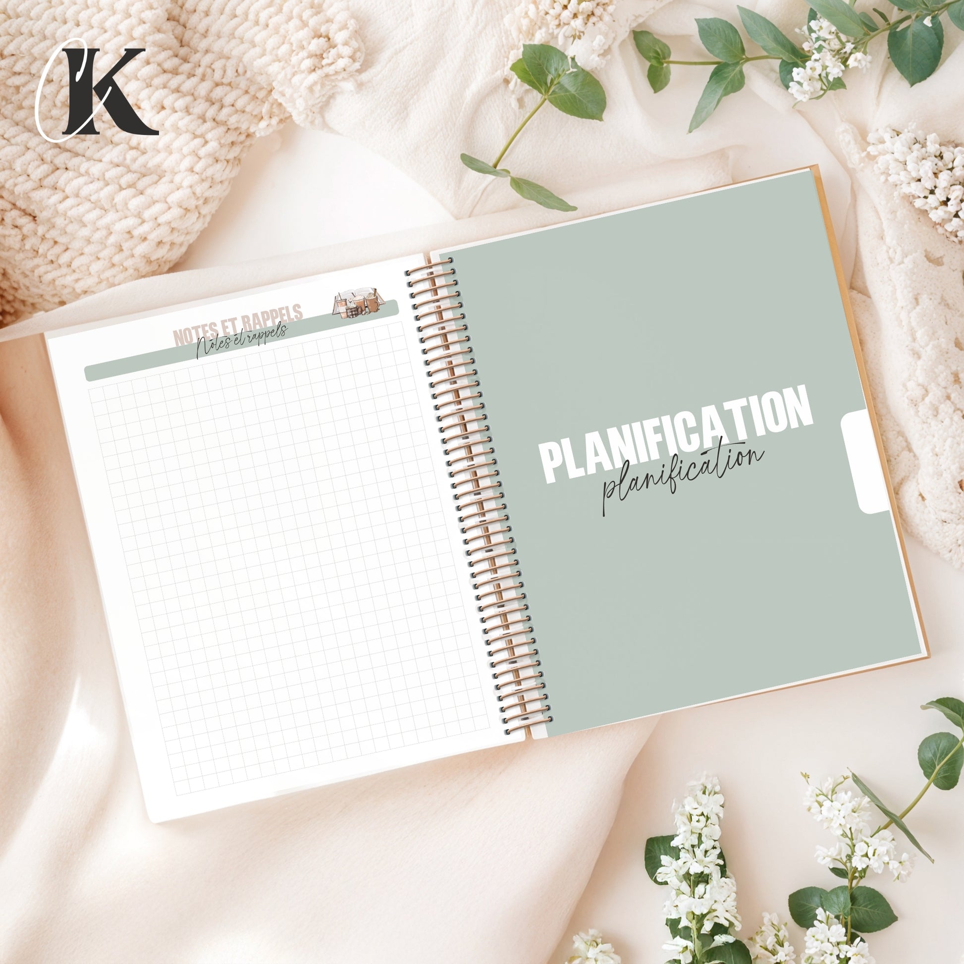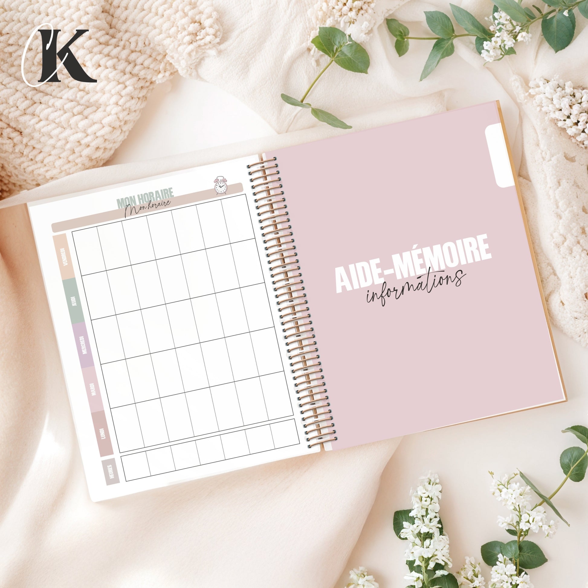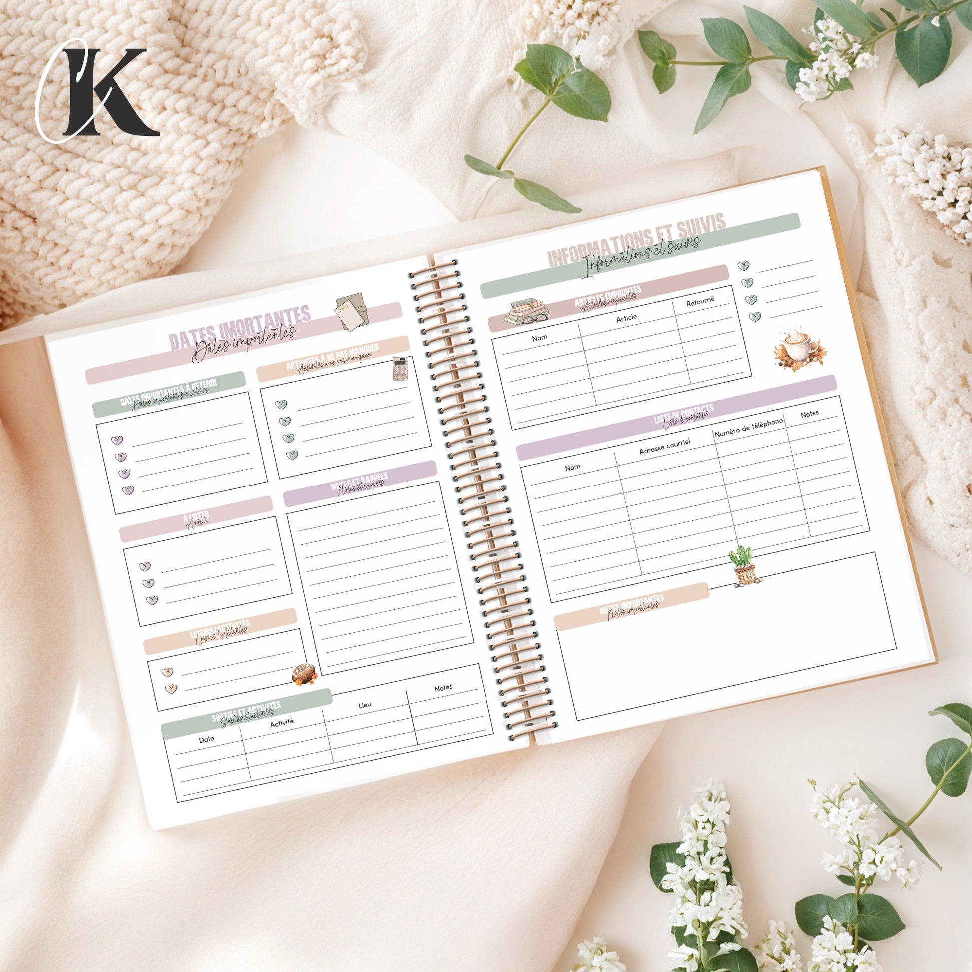 - Pages utiles : page d'identification, horaire, contacts, dates importantes (activités, rendez-vous, etc.), accès numérique, anniversaires, suivi de lecture, suivi des habitudes, fin d'année