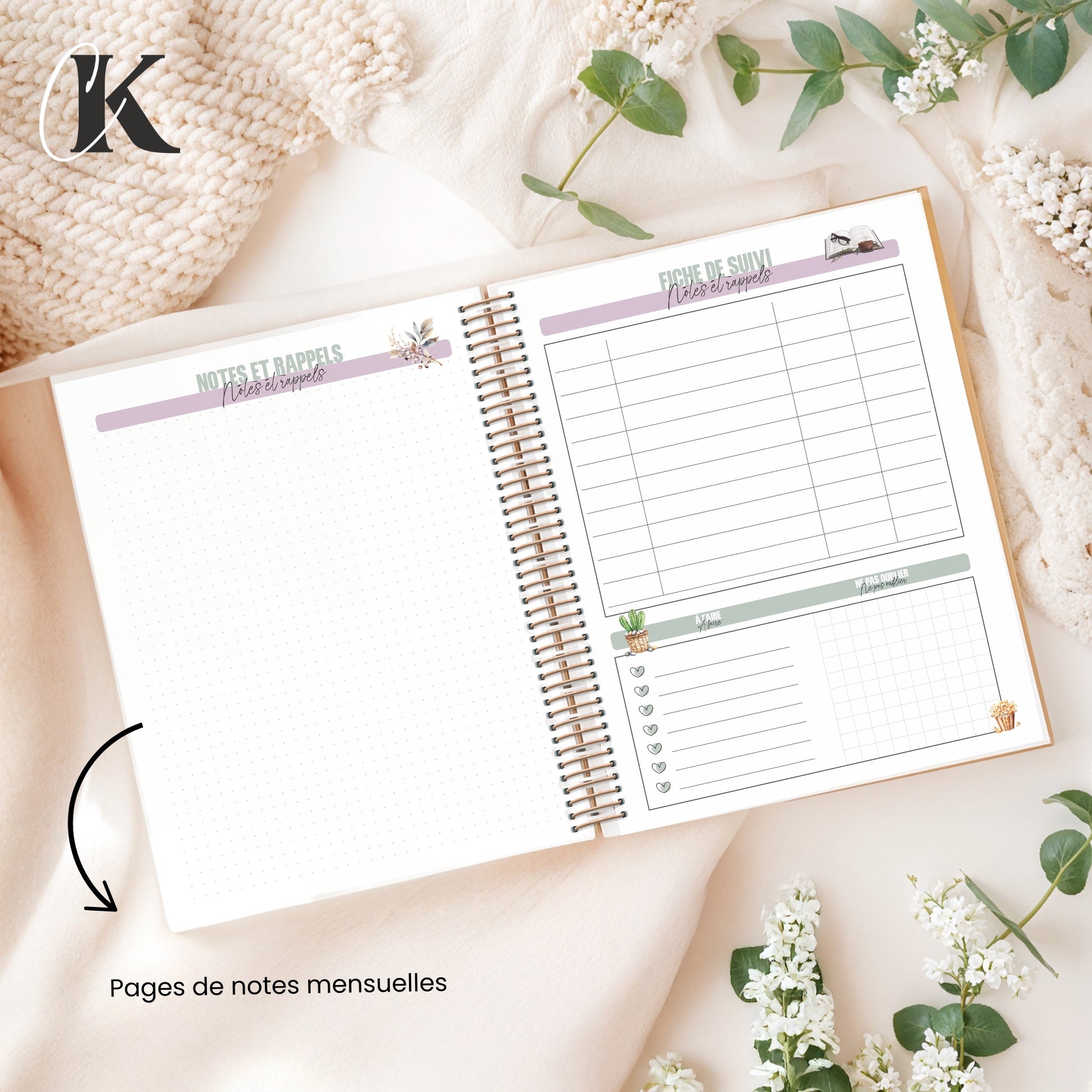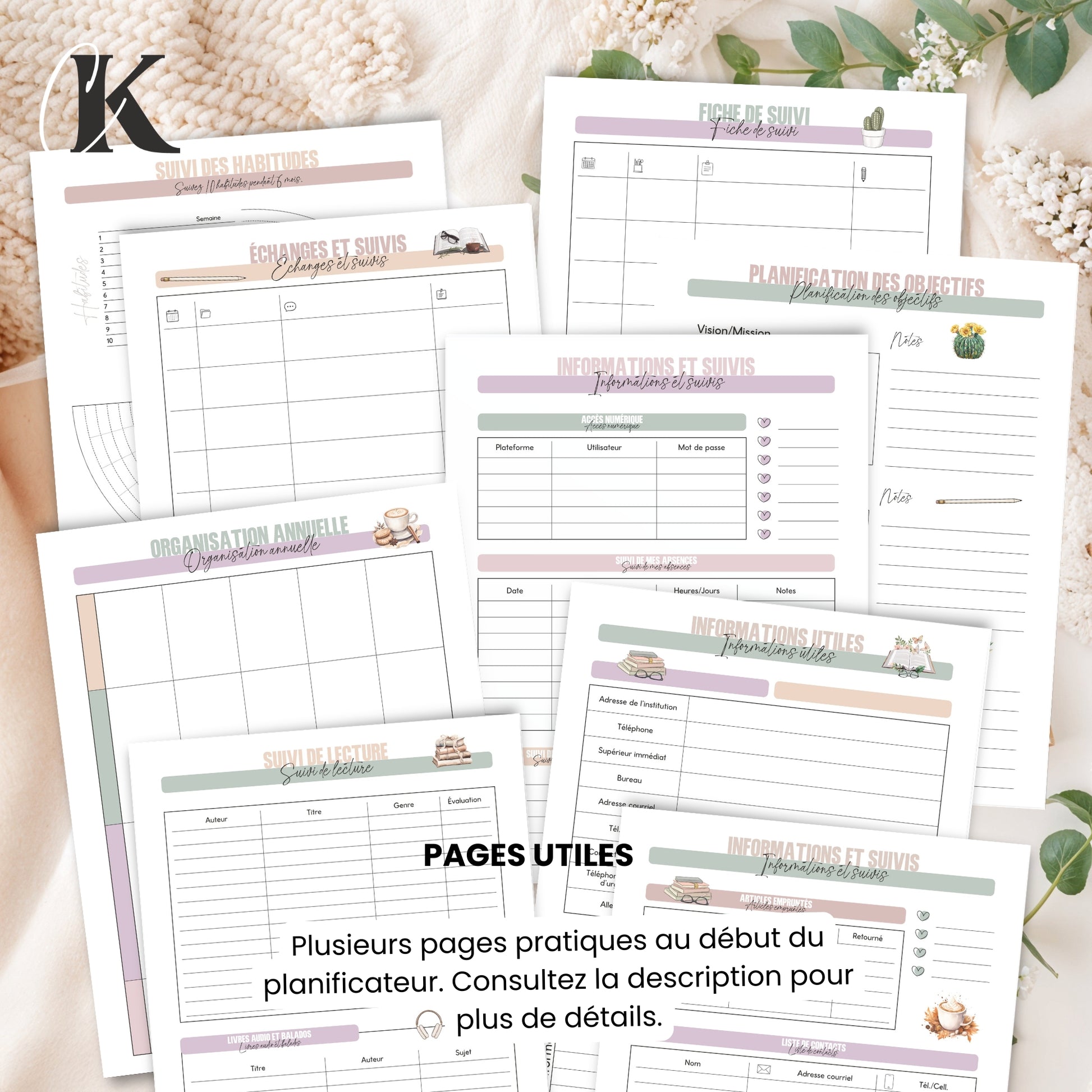 - Fiches de suivis et d'échéances (pages flexibles): adaptez-les selon vos besoins