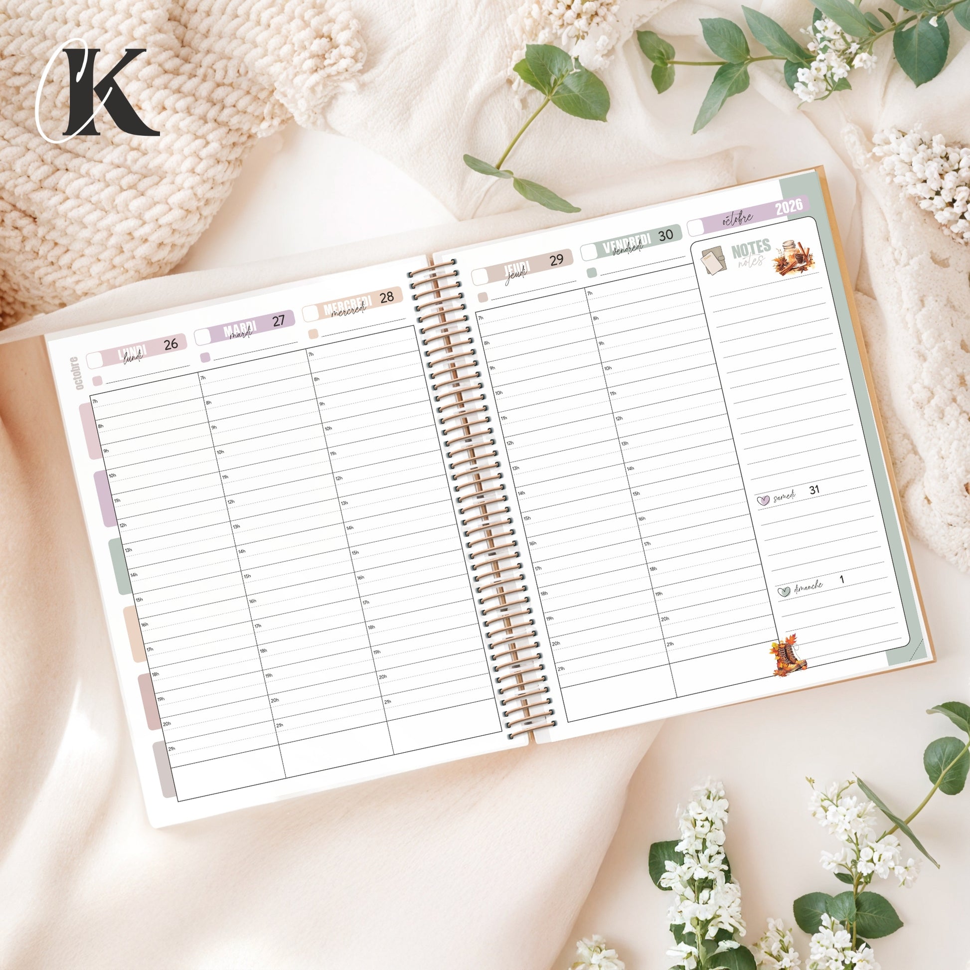 - Semainiers : plage horaire de 7 h à 21 h; espace pour samedi et dimanche, espace pour vos notes